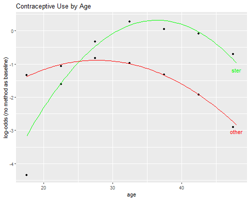 + ggtitle("Contraceptive Use by Age") + ylab("log-odds (no method as baseline)") +